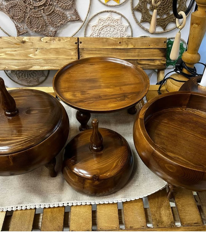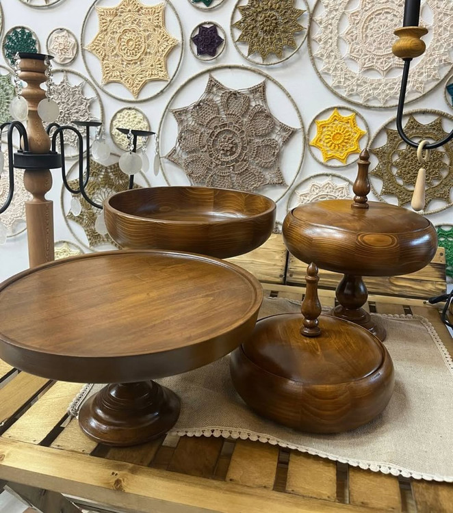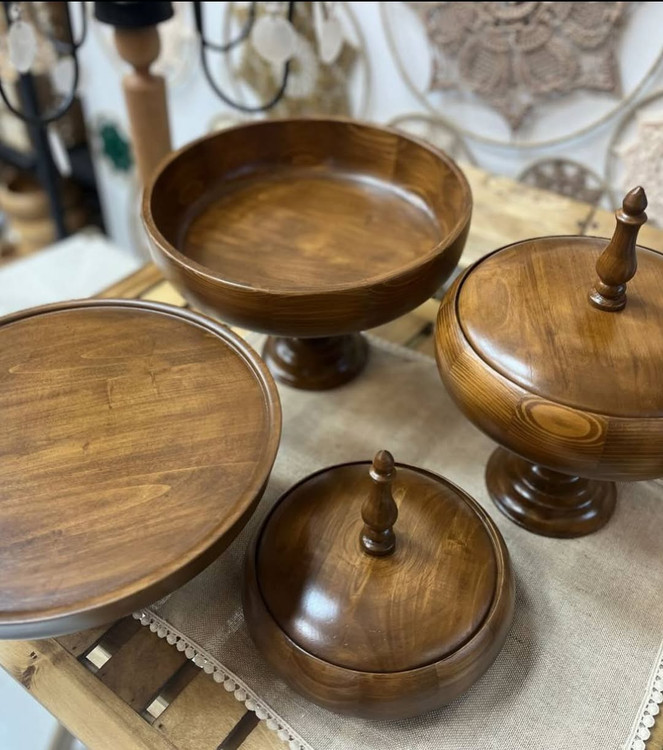 ست پذیرایی چوبی لوکس ۴ تکه شامل: میوهخوری، شیرینیخوری، آجیلخوری در دار و شکلاتخوری در دار، ساخته شده از چوب راش با کیفیت بالا.